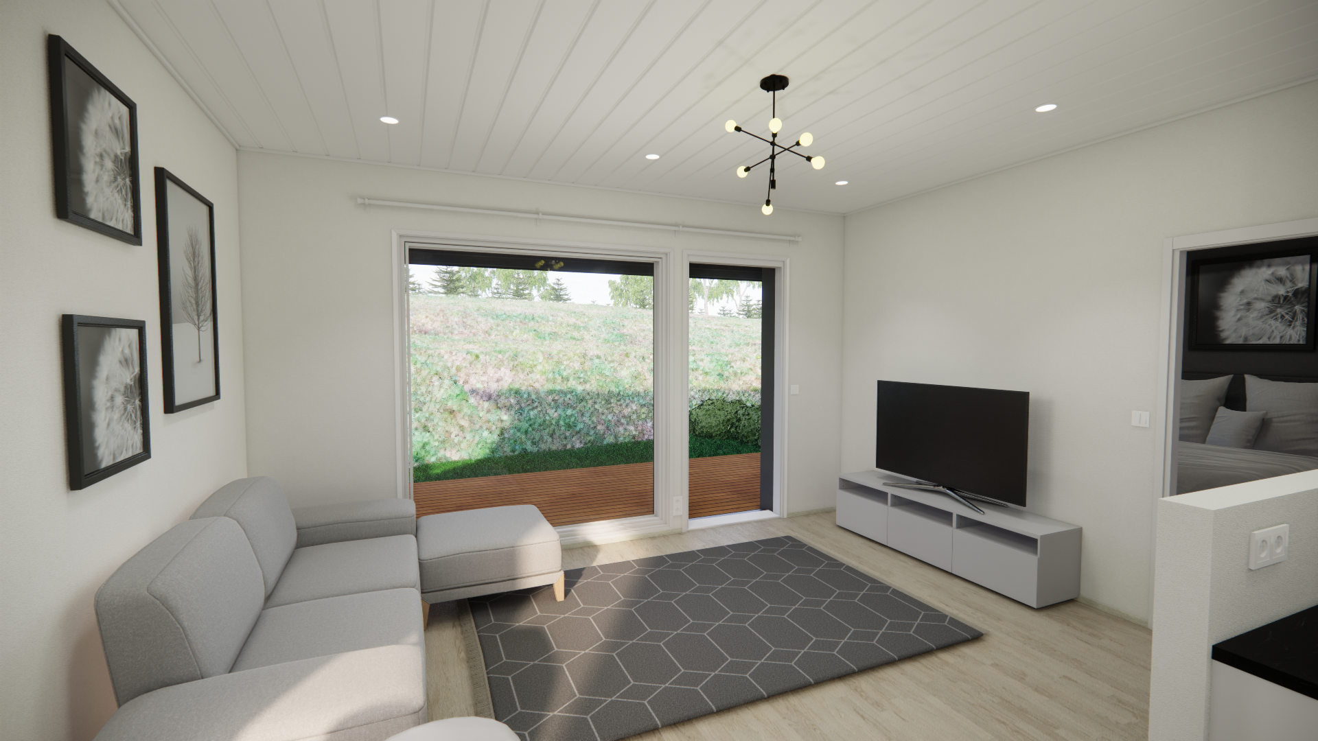 Olohuoneessa suuret ikkunat ja ovi katetulle takaterassille.
