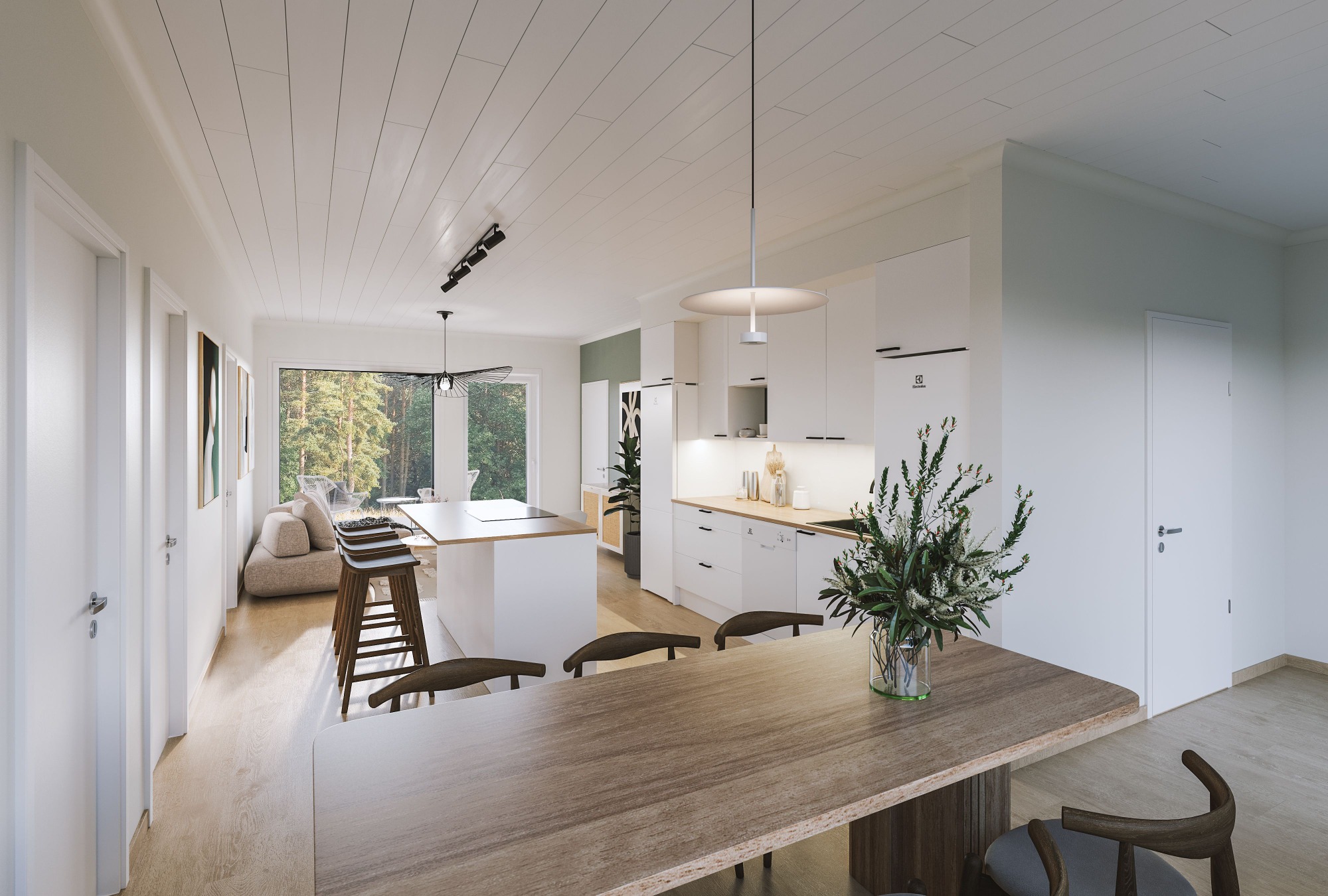 Tilava ja valoisa nykyaikainen saarekekeittiö, jossa reilusti tilaa isommallekin ruokapöydälle.