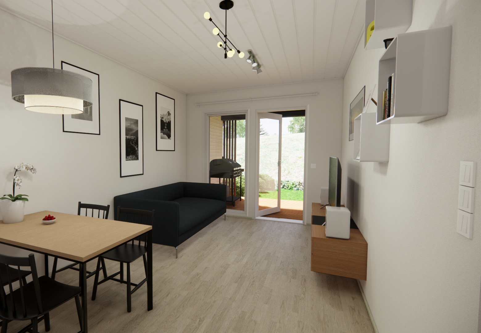 Valoisa olohuone, jossa iso ikkuna ja ovi katetulle terassille.