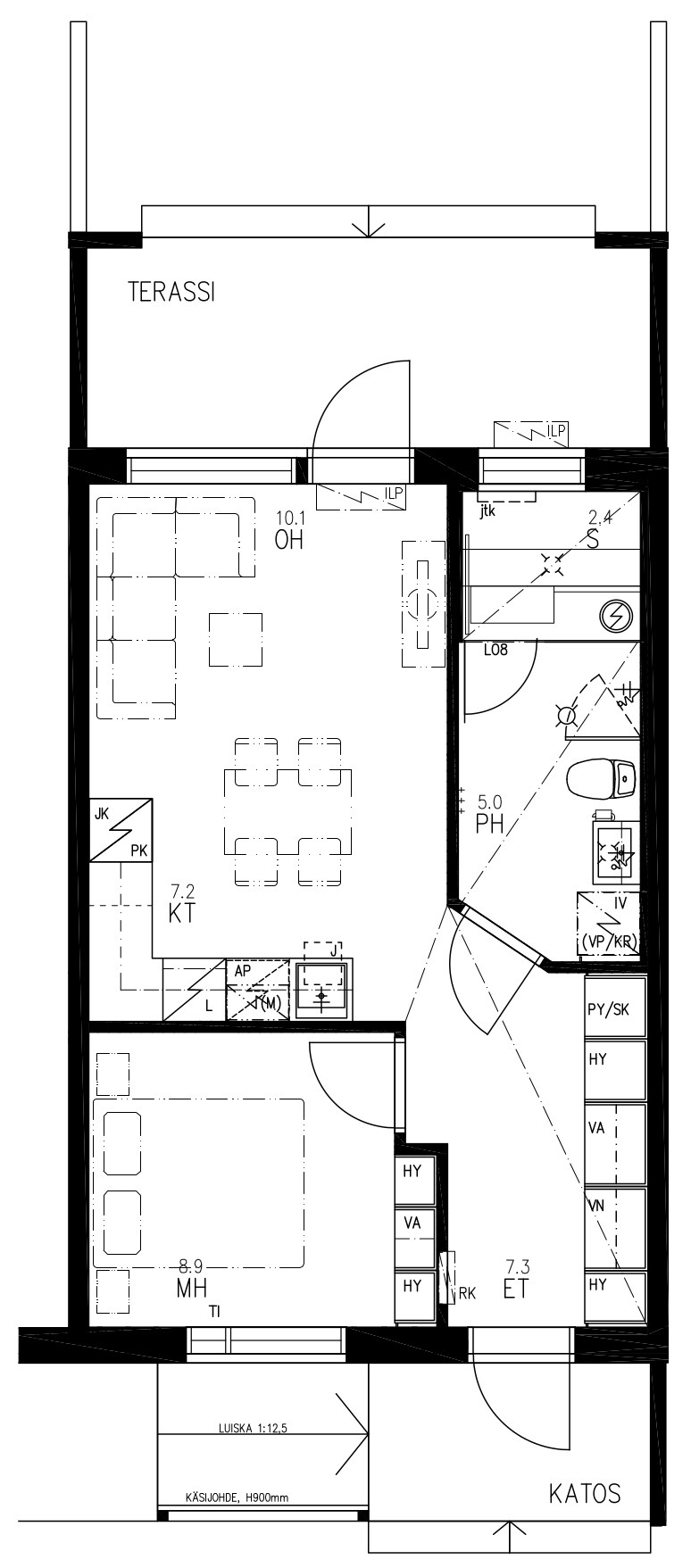 Toimiva saunallinen rivitalokaksio on varustettu viilennyksellä ja koko asunnon levyisellä katetulla terassilla. Terassi on mahdollista myös lasittaa. Valoisassa olohuoneessa lähes lattiaan ulottuva ikkuna ja ovi katetulle terassille. Saunassa lasiseinä, pilarikiuas ja kuituvalot.